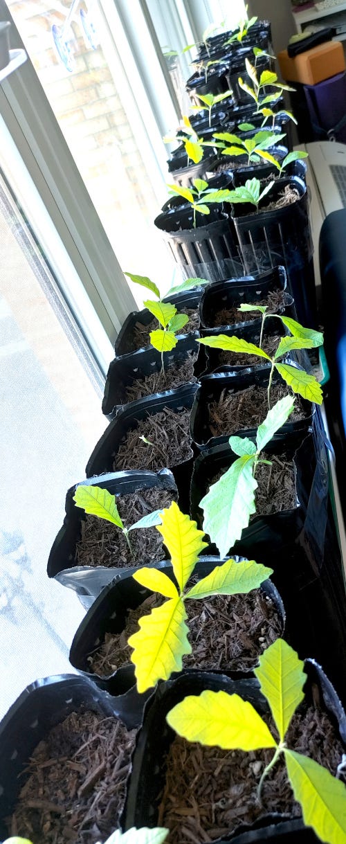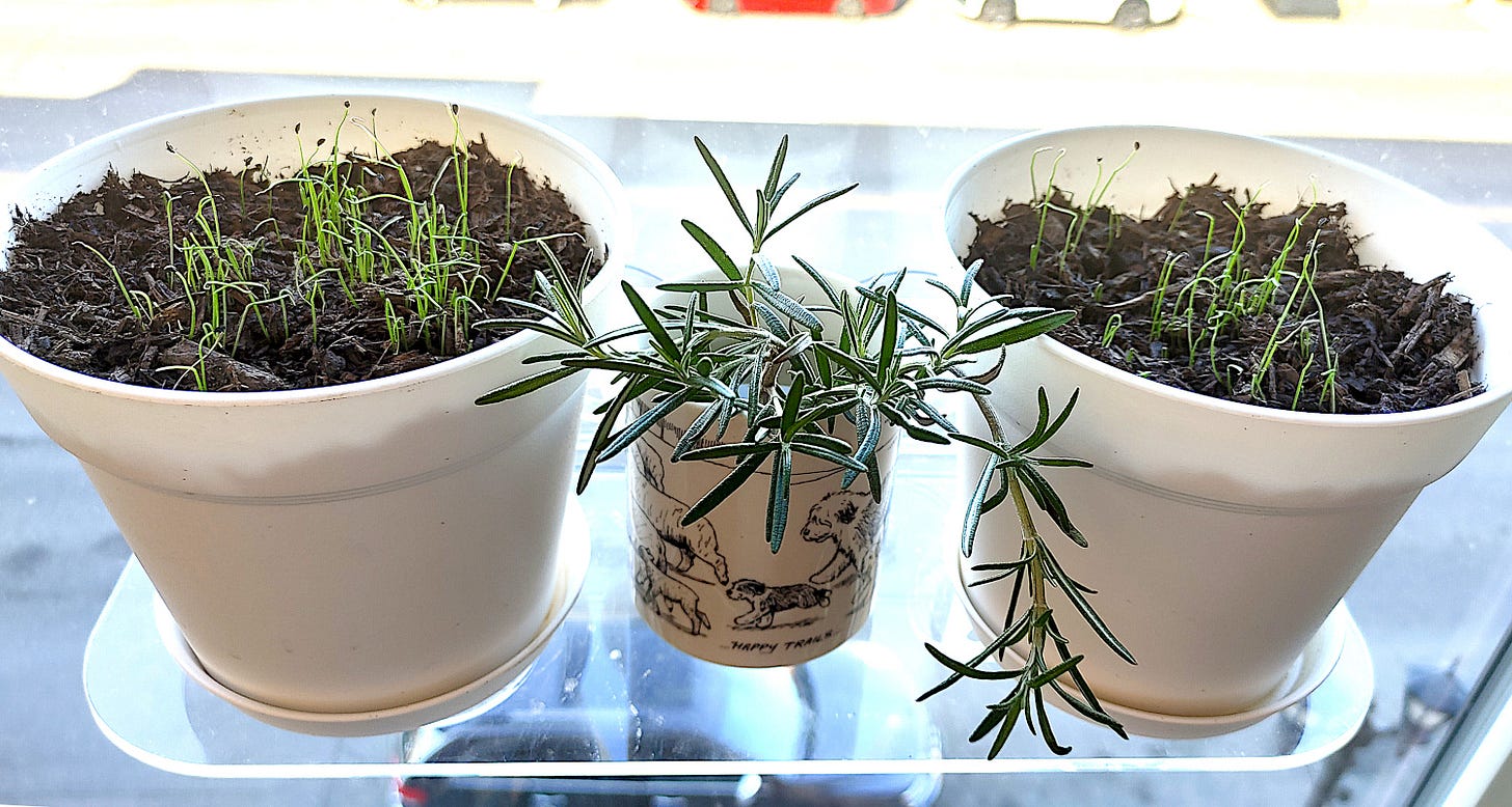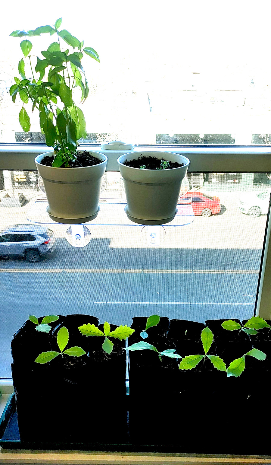 As we continue working on our Vermont Urban Farm project, we have found a small but lovely apartment to serve as our temporary home. As nice as it is, one thing became really clear: we missed growing food and sharing our home with other living things. Our solution was to convert a large west-facing window into a lovely window garden, where we are growing 30 seadling oak trees that we plan on bringing to Vermont to line our driveway. We are also growing some of our favorite spices, like rosemary, chives and basil, along with some different varieties of lettuce.